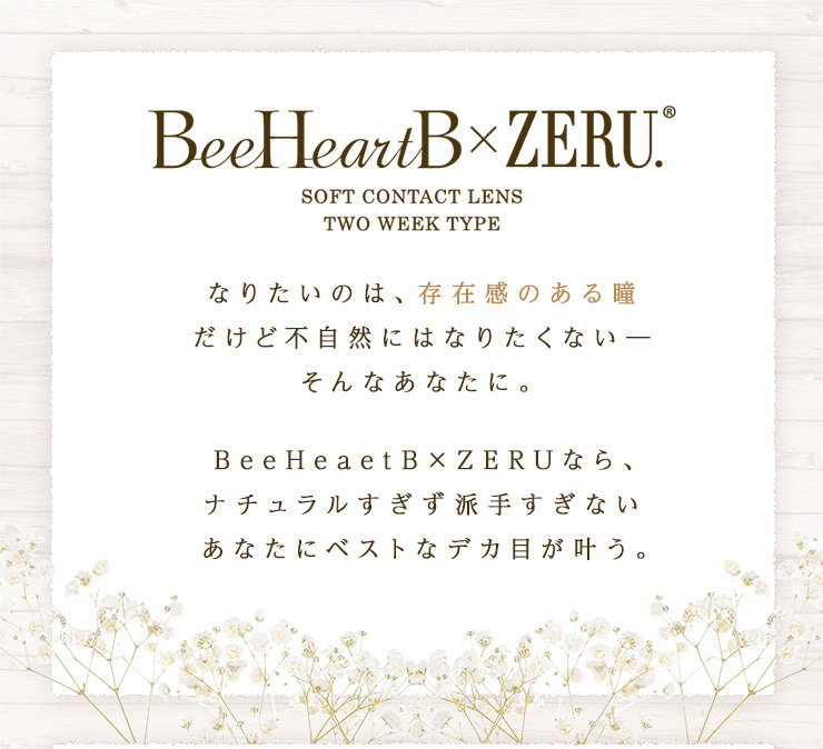 商品スペック ・商品名:BeeHeartB by ZERU. ・販売名:キュートビュー14UVM ・高度管理医療機器承認番号:30100BZX00026A01 ・使用期限:2週間使い捨て ・入数:1箱6枚 ・BC:8.6mm ・DIA14.0mm:301キャラメルブラウン(着色直径)13.4mm ・DIA14.3mm:302ピンクブラウン(着色直径)13.6mm ・度数:±0.00、-0.50〜-6.00(0.25ステップ)、-6.50〜-10.00(0.50ステップ) ・含水率:38% ・製造国:台湾 ・製造販売元:SHO-BI Labo株式会社 ・販売元:株式会社ZERU. ・区分:高度管理医療機器 ・カラー:301-CB(キャラメルブラウン)、302-PB(ピンクブラウン) ・機能:UV加工、モイスト 使用上のご注意 ・コンタクトレンズは「高度管理医療機器」です。